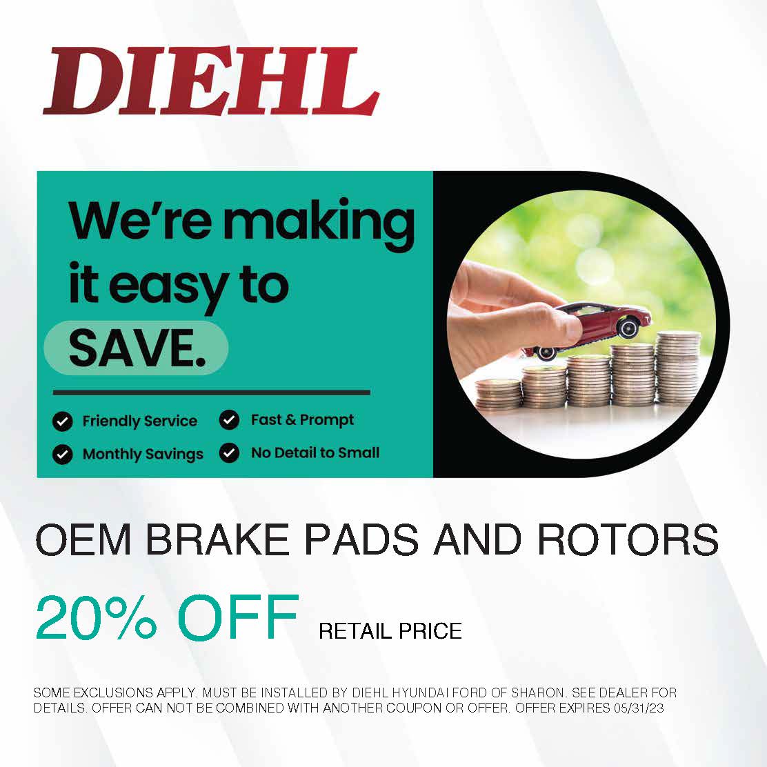 At Diehl Automotive, we want to make sure that your vehicle is properly inspected, and you receive top service for inspections and brake replacement. Don’t miss out on our Brake Specials this month and schedule your Service Appointment today at Diehl Hyundai of Sharon!