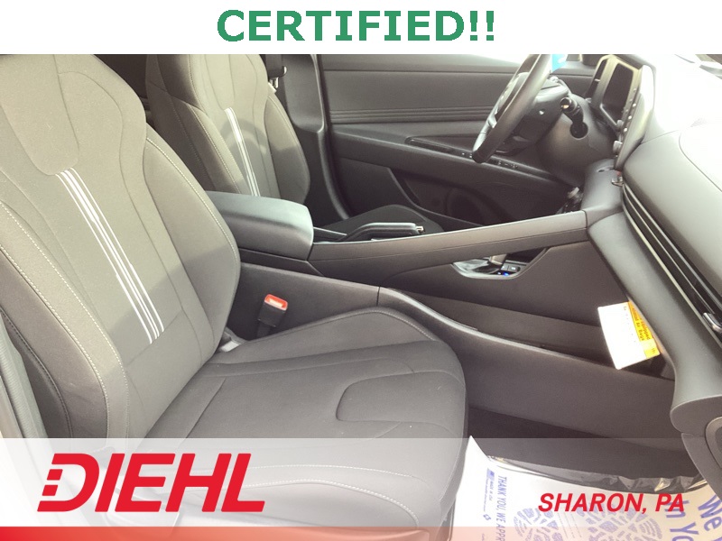 17" x 7.0J Alloy Wheels, 4-Wheel Disc Brakes, 6 Speakers, ABS brakes, Air Conditioning, Alloy wheels, AM/FM radio, Apple CarPlay & Android Auto, Auto High-beam Headlights, Automatic temperature control, Brake assist, Bumpers: body-color, Cargo Blocks, Cargo Net, Cargo Package, Cargo Side Bins, Carpeted Floor Mats, Delay-off headlights, Driver door bin, Driver vanity mirror, Dual front impact airbags, Dual front side impact airbags, Electronic Stability Control, Exterior Parking Camera Rear, Front anti-roll bar, Front Bucket Seats, Front Center Armrest, Front dual zone A/C, Front reading lights, Front wheel independent suspension, Fully automatic headlights, Illuminated entry, Leather Shift Knob, Leather steering wheel, Low tire pressure warning, Occupant sensing airbag, Option Group 01, Outside temperature display, Overhead airbag, Overhead console, Panic alarm, Passenger door bin, Passenger vanity mirror, Power door mirrors, Power steering, Power windows, Premium Cloth Seat Trim, Radio: AM/FM/HD Display Audio, Rear side impact airbag, Rear window defroster, Remote keyless entry, Reversible Cargo Tray, Security system, Speed control, Speed-sensing steering, Spoiler, Steering wheel mounted audio controls, Tachometer, Telescoping steering wheel, Tilt steering wheel, Traction control, Trip computer, Variably intermittent wipers, Wheel Locks. Certified. Fluid Metal 2025 Hyundai Elantra SEL Sport FWD CVT I4