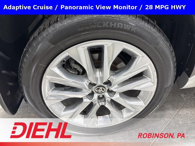 Safety is a standout, with Toyota Safety Sense features including Pre-Collision System, Lane Change Assist with Lane Tracing Assist, Blind Spot Monitor, Rear Cross-Traffic Alert, Dual-stage front airbags, seat-mounted side airbags, and tire-pressure monitoring. Exterior details such as LED headlights, automatic high beams, perimeter lighting, rear spoiler, splash guards, and power rear cargo access add both style and daily usability.